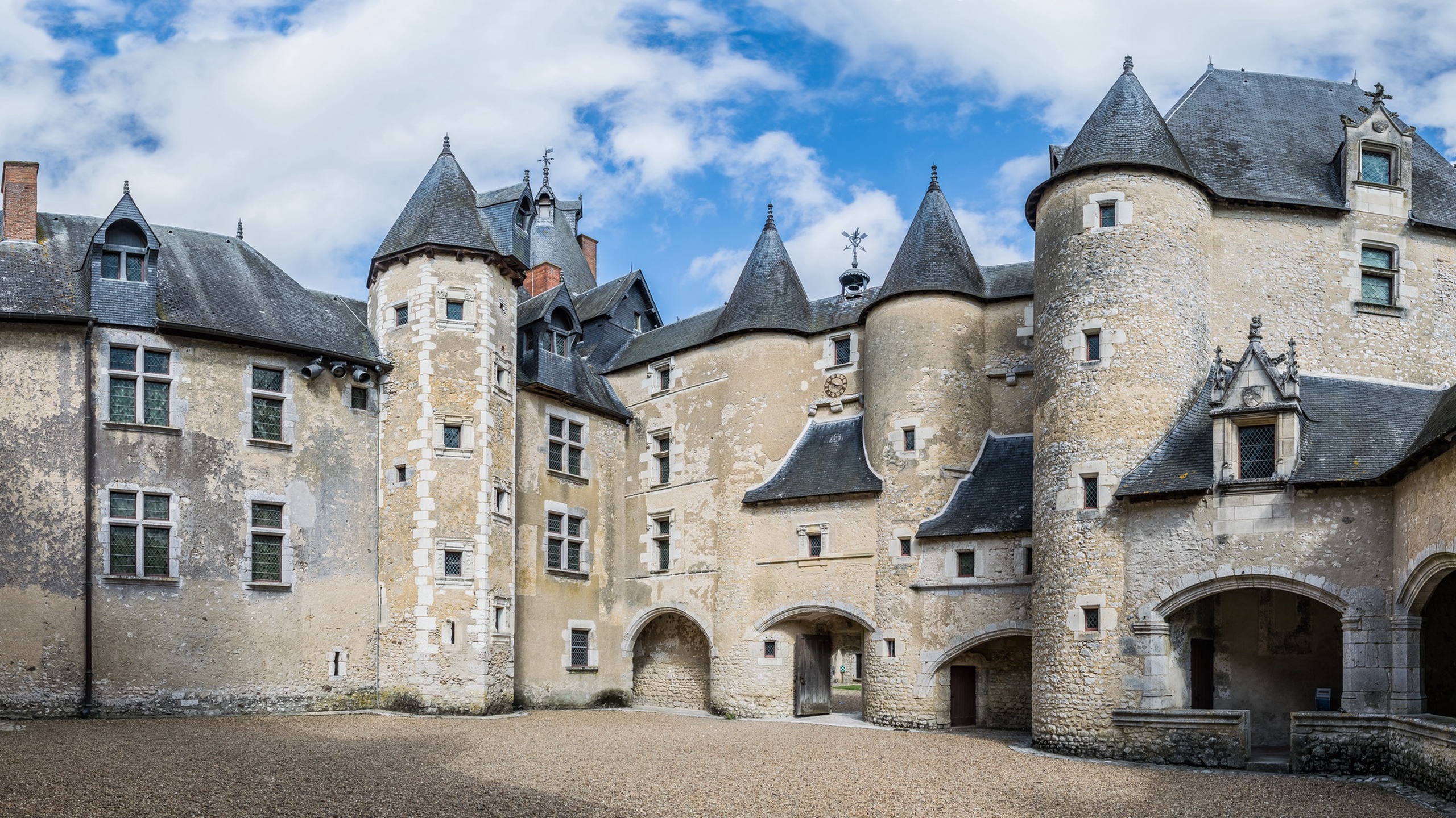 Built from 1465 by Pierre de Refuge, treasurer to King Louis XI, this Loire Valley castle presents a striking contradiction: its exterior bristles with military features — cannon loops, machicolations, a drawbridge, and a crenellated wall walk — yet it was constructed over a decade after the Hundred Years' War ended, in flat terrain with no strategic value. The fortifications were political theater, a display of power for the royal court. Step through the gatehouse and the mood shifts entirely: the inner courtyard reveals refined Renaissance decoration, mullioned windows, and an arcaded gallery inspired by the nearby Château de Blois, added around 1510-1520 by Jean de Villebresme.