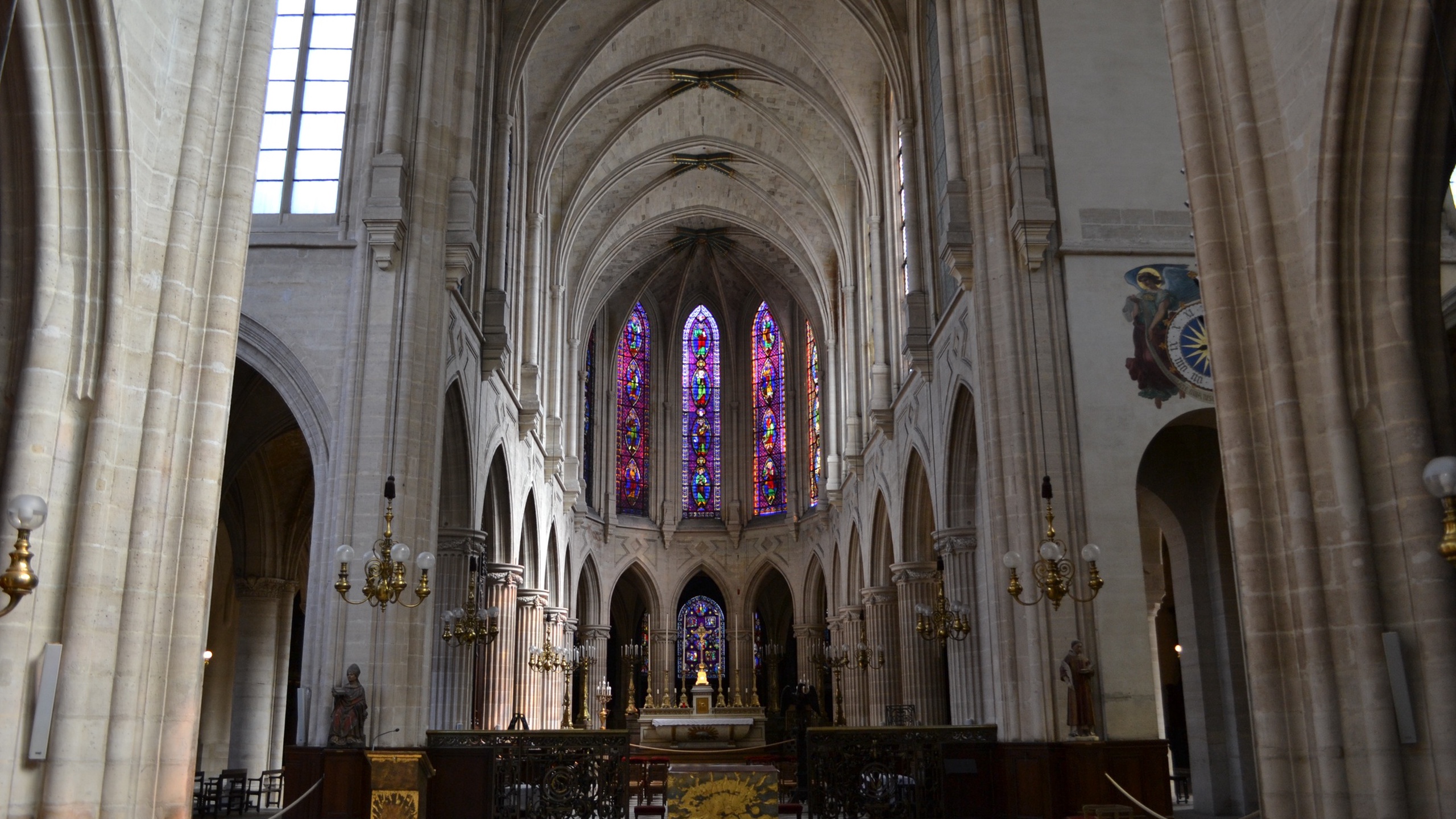 Saint-Germain l'Auxerrois served as the parish church for France's royal court from the 12th century onward, standing directly opposite the Louvre. The current building combines elements from five centuries of construction, with a 12th-century Romanesque bell tower, 13th-century Gothic nave and choir, and a 15th-century Flamboyant Gothic porch considered one of the finest in Paris. Inside, visitors find a carved Flemish altarpiece from around 1515 depicting the Passion of Christ, 17th-century church wardens' pews designed by Charles Le Brun, and an exceptional organ built by François-Henri Clicquot in 1771, originally made for the Sainte-Chapelle.
