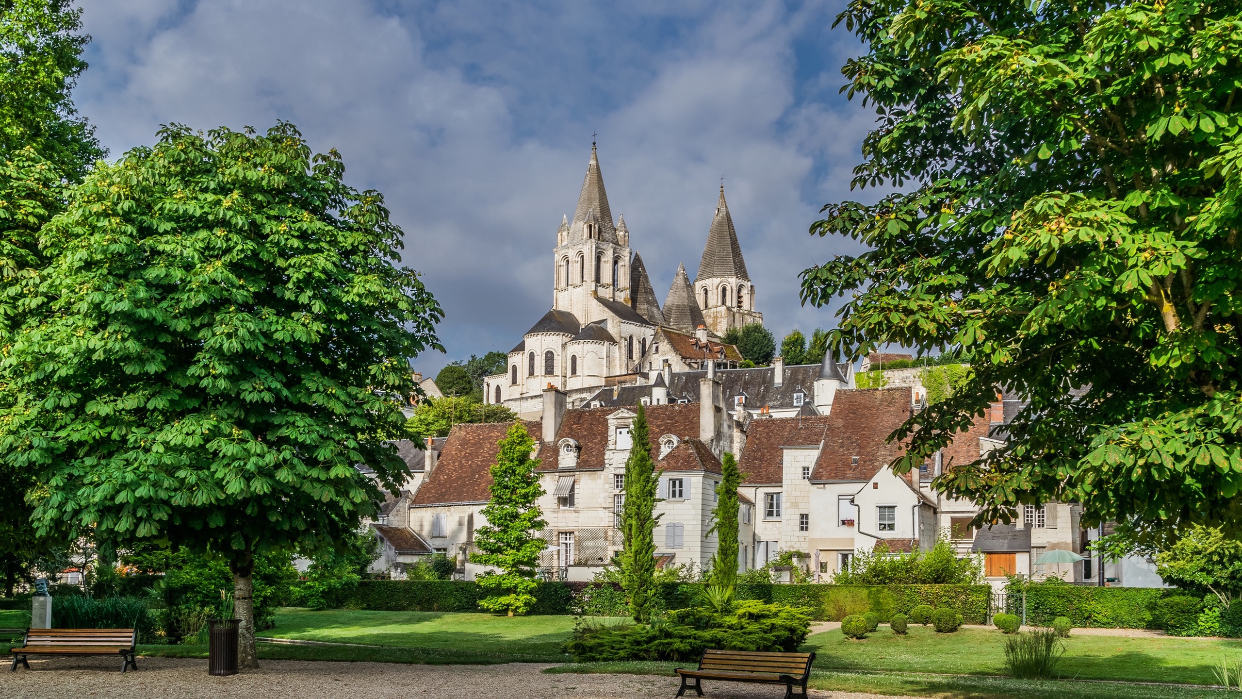 The Collegiate Church of Saint-Ours stands on a rocky promontory in the upper town of Loches, next to the royal lodge where Charles VII held court. Built between the 11th and 12th centuries, this Romanesque church is defined by its two hollow octagonal pyramidal spires — called "dubes" — that cover the nave, a roofing system found nowhere else in France. The main portal, dating to around 1150, retains traces of its original medieval polychrome paint and depicts fantastical animals alongside an unusual representation of the seven liberal arts.