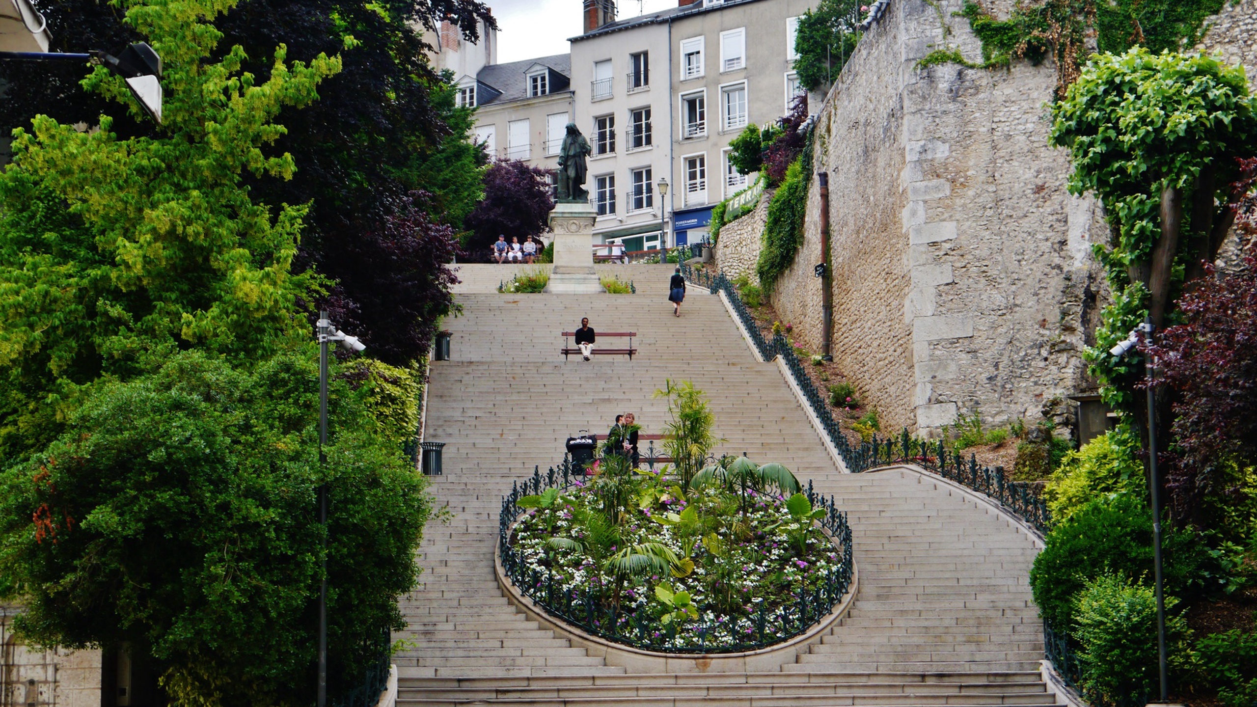 A monumental limestone staircase of 122 steps connecting the upper town of Blois to the Loire riverbank below, built between 1864 and 1869 as part of a Haussmann-inspired urban redesign. Architect Jules de la Morandière originally proposed a far grander project with converging ramps, fountains, and statues, but budget constraints produced the current three straight ramps separated by landings. At the summit stands a bronze statue of Denis Papin by sculptor Aimé Millet, inaugurated in 1880, showing the inventor holding his pressure cooker — the device that laid the groundwork for steam engine technology.