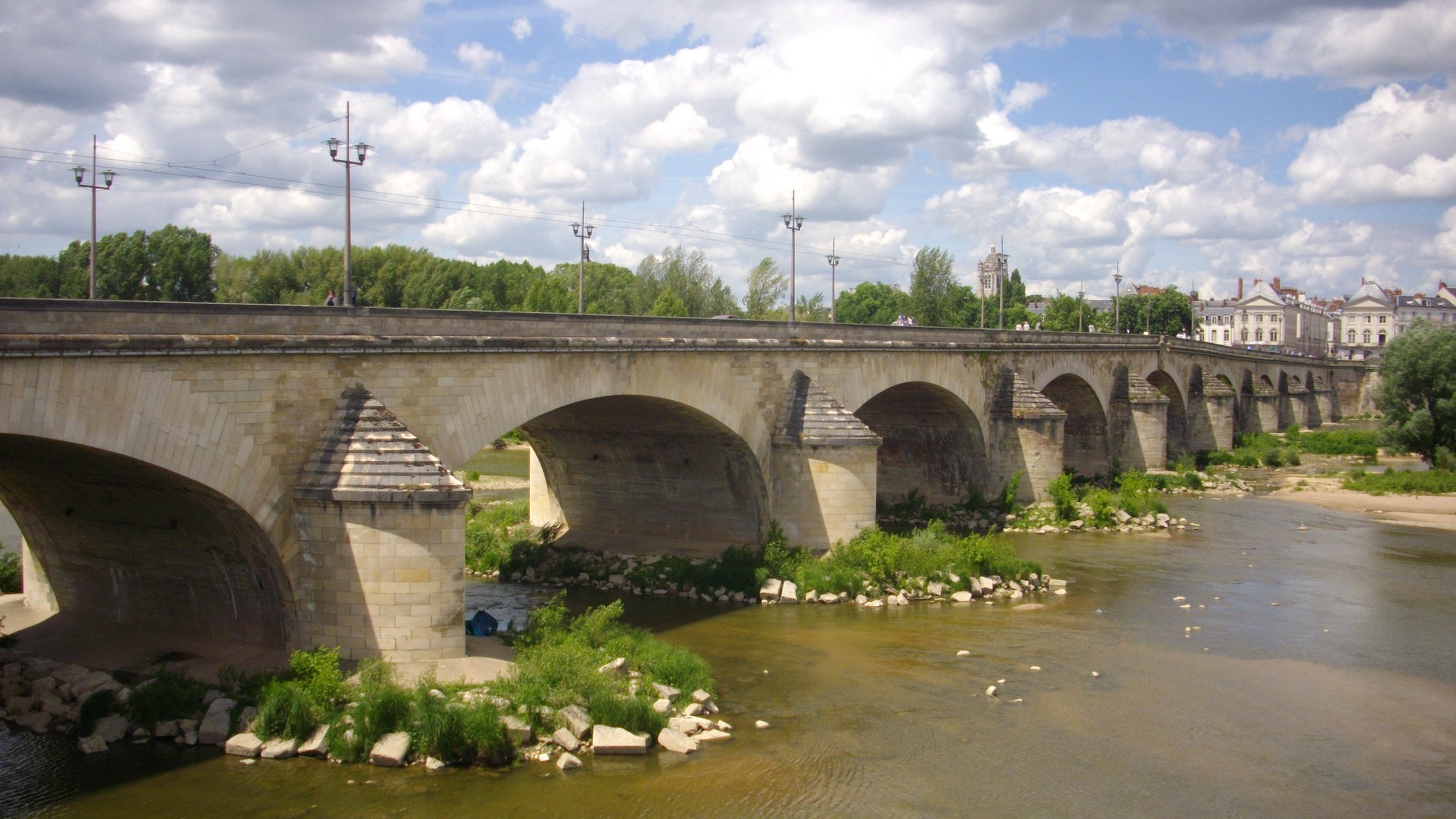 The George V Bridge is a 325-meter stone arch bridge spanning the Loire River in central Orléans, built between 1751 and 1763 by engineer Jean Hupeau. Its nine basket-handle arches decrease slightly in span from the center toward the banks, creating a nearly flat profile that was considered a technical achievement for its time. Originally called the Pont Royal, it was renamed in 1914 to honor King George V of the United Kingdom as a gesture of Franco-British solidarity at the start of World War I.